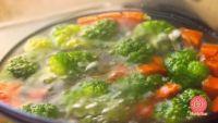 4.在锅中加入适量的橄榄油,加入虾仁和洋葱煸炒至熟。最后加入过水后的兰花和胡萝卜一起煸炒