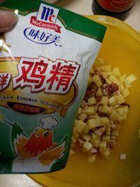 2.土豆去皮洗净切成小丁用清水冲两边,控水后加入盐腌一会腌出水分,挤干水分。