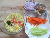 3:莴笋,胡萝卜切二粗丝用少许盐腌上。洋葱切丝。