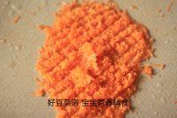 9. 胡萝卜擦成细丝。胡萝卜不容易熟,擦得细一点比较容易熟。