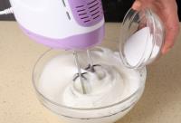 13.打至体积膨大,变的很浓稠,加入30g细砂糖。然后把电动打蛋器转中速打发蛋白,打至表面有纹路,加入40g细砂糖。一次性加入太多的细砂糖会抑制蛋白霜的发泡,但是加的太少的话又会使得气泡过多,所以细砂糖最好分3次加入蛋白霜里搅打)